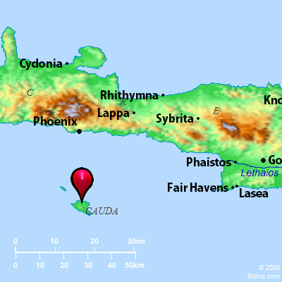 ko'-da (Kauda; also called Klauda; the King James Version Clauda; the modern Greek name Gaudho supports the form Cauda): An island 23 miles West of Cape Matala. It is a small island, and can never have supported a large population, or have been of any importance. Its elevation to the rank of a bishopric in Byzantine times must have been due to its association with the voyage of Paul. The ship with Paul on board was driven under the lee of Cauda (Acts 27:16); in the calm water south of the island the crew succeeded in hauling in the boat, undergirding the ship and slackening sail.