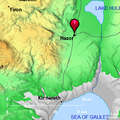 (1) The royal city of Jabin (Joshua 11:1), which, before the Israelite conquest, seems to have been the seat of a wide authority (Joshua 11:11). It was taken by Joshua, who exterminated the inhabitants, and it was the only city in that region which he destroyed by fire (11:11-13). At a later time the Jabin Dynasty appears to have recovered power and restored the city (Judges 4:2). The heavy defeat of their army at the hands of Deborah and Barak led to their final downfall (Judges 4:23). It was in the territory allotted to Naphtali (Joshua 19:36). Hazor was one of the cities for the fortification of which Solomon raised a levy (1 Kings 9:15). Along with other cities in Galilee, it was taken by Tiglathpileser III (2 Kings 15:29). In the plain of Hazor, Jonathan the Maccabee gained a great victory over Demetrius (1 Maccabees 11:67). In Tobit 12 it is called "Asher" Septuagint Aser), and Kedesh is said to be "above" it. Josephus (Ant., V, v, 1) says that Hazor was situated over the lake, Semechonitis, which he evidently identifies with the Waters of Merom (Joshua 11:13). It must clearly be sought on the heights West of el-Chuleh. Several identifications have been suggested, but no certain conclusion can be reached. Some (Wilson and Guerin) favor Tell Harreh to the Southeast of Qedes, where there are extensive ruins. Robinson thought of Tell Khureibeh, 2 1/2 miles South of Qedes, where, however, there are no ruins. We may take it as certain that the ancient name of Hazor is preserved in Merj el-Chadireh, Southwest of Qedes, and North of Wady `Uba, and in Jebel Chadireh, East of the Merj, although it has evidently drifted from the original site, as names have so often done in Palestine. Conder suggests a possible identification with Chazzur, farther South, "at the foot of the chain of Upper Galilee. in position more appropriate to the use of the chariots that belonged to the king of Hazor" (HDB, under the word).
